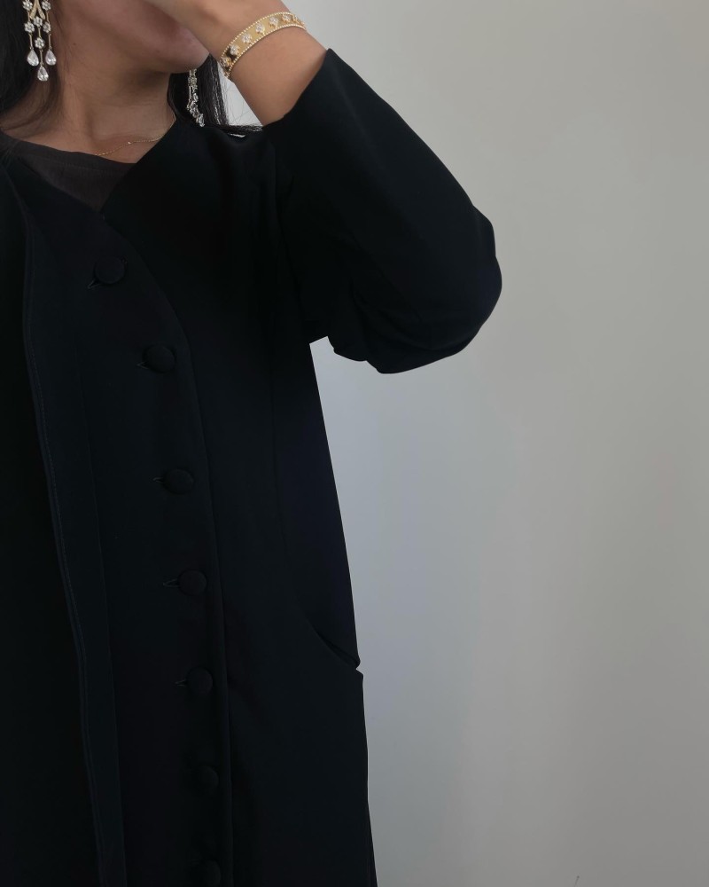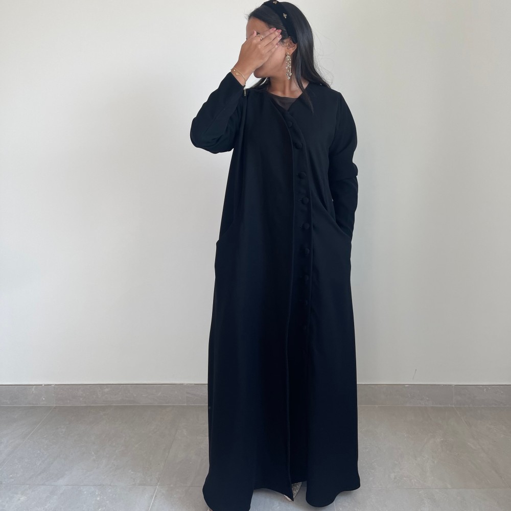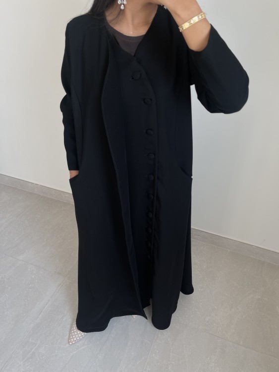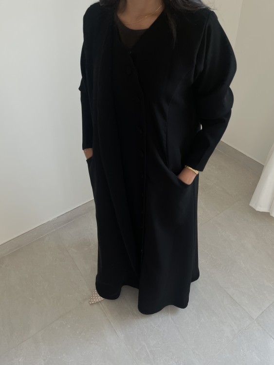 عبايه ربع كلوش من كريب سراميك مع ازارير وطرحه سوداء ساده