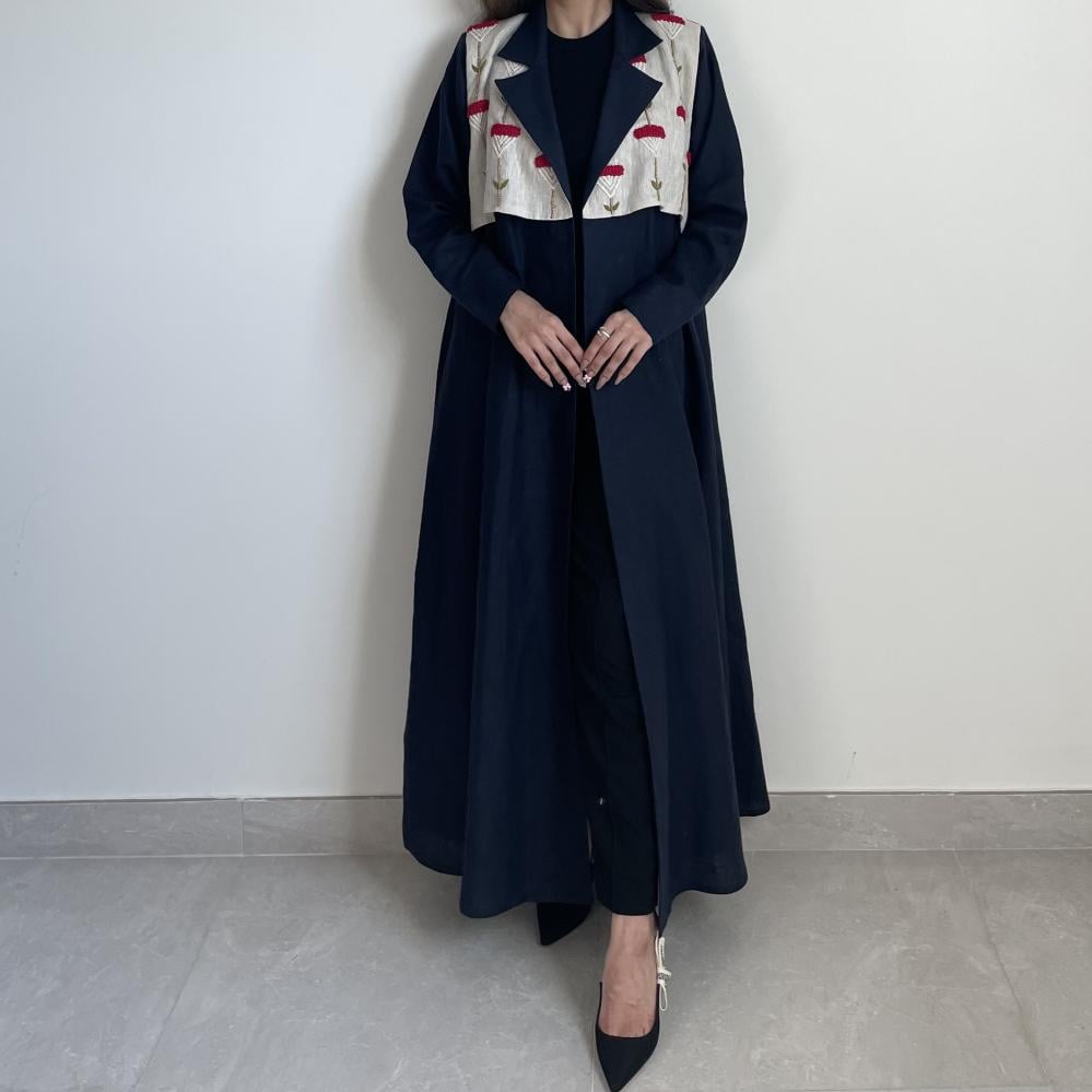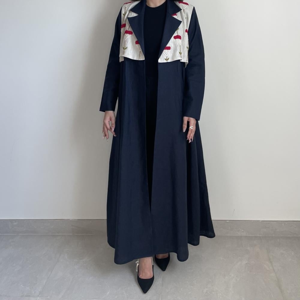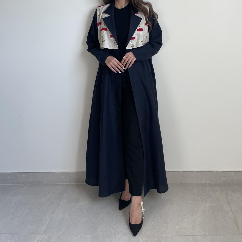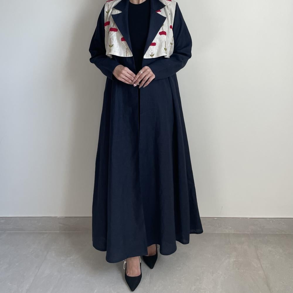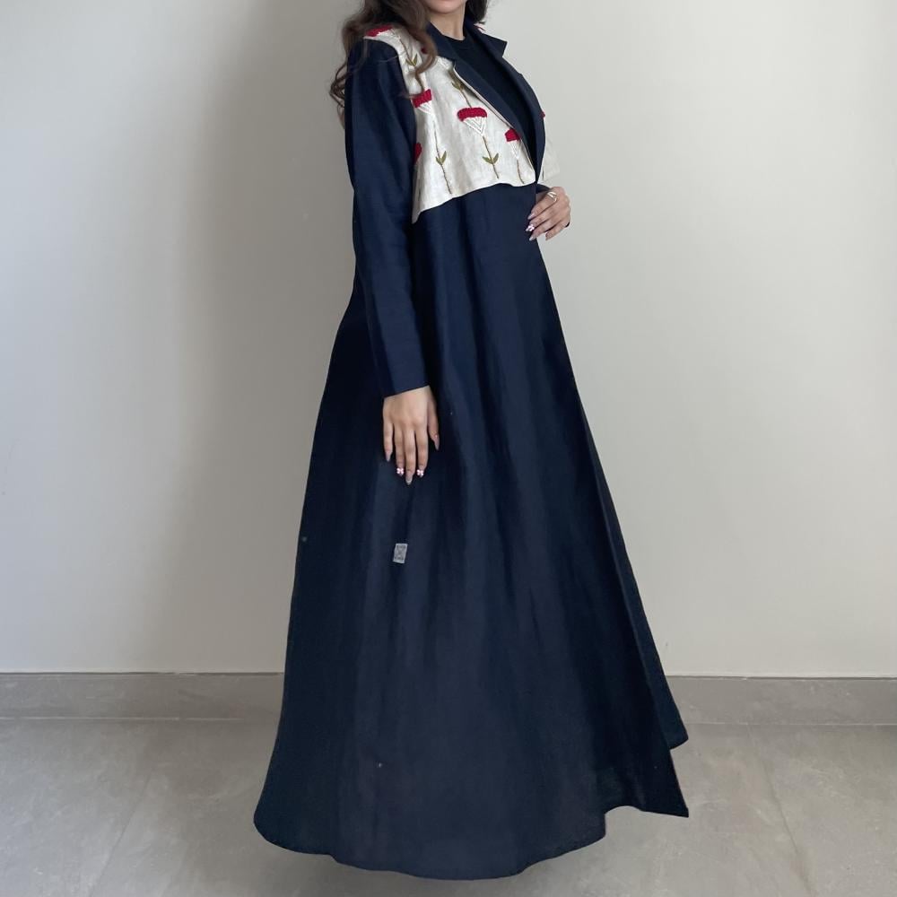 لينن طبيعي كحلي مع تطريز خيوط ، طرحه طرف طويل لينن ، قصة نص كلوش