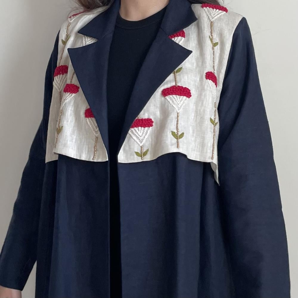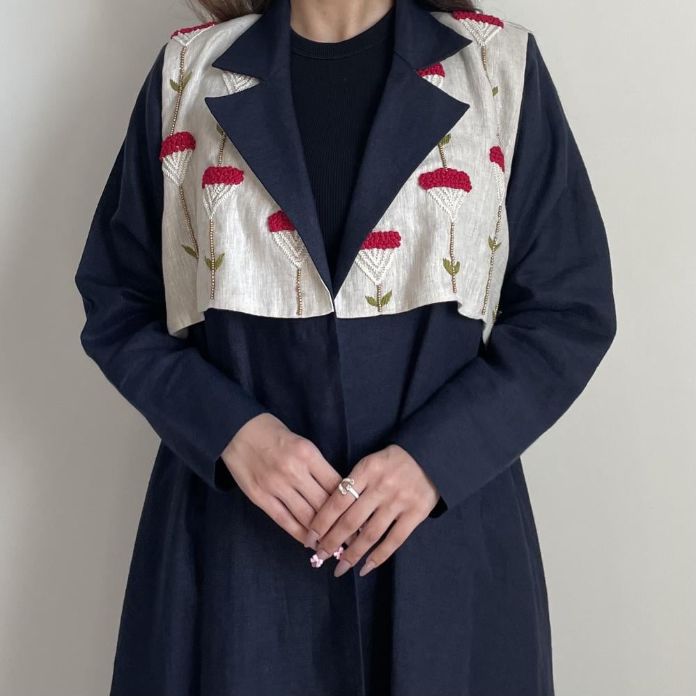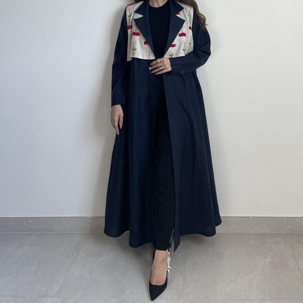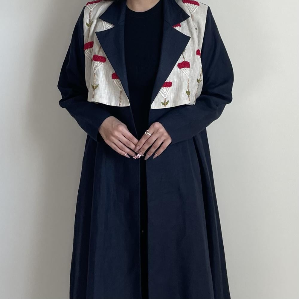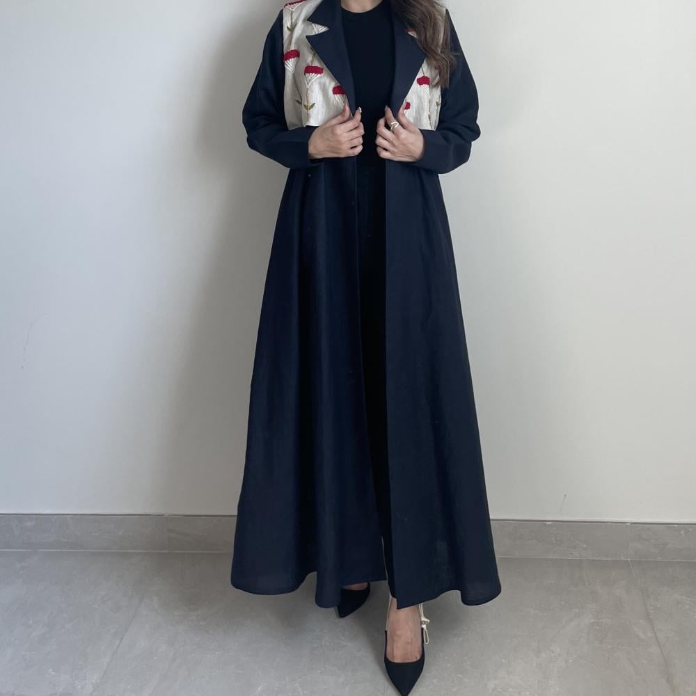 لينن طبيعي كحلي مع تطريز خيوط ، طرحه طرف طويل لينن ، قصة نص كلوش